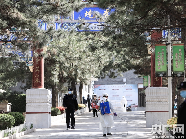 工作人員正在對路面進(jìn)行消毒(央廣網(wǎng)記者 黃一博 攝)