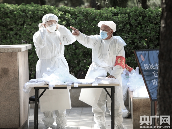 工作人員身著防護(hù)服,為前來祭掃的人們提供免費便民水袋和毛巾(央廣網(wǎng)記者 黃一博 攝)