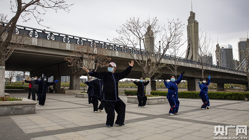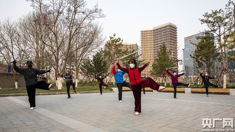 市民在戶外打太極拳,堅(jiān)持“一米線”安全距離(央廣網(wǎng)記者 張佳琪 攝)