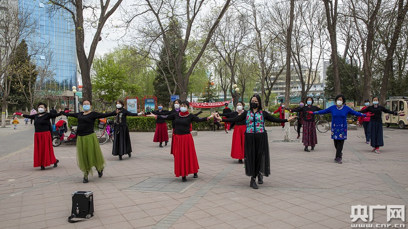喜愛跳舞的市民運(yùn)動時(shí)也戴起了口罩(央廣網(wǎng)記者 張佳琪 攝)