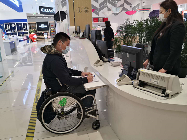 殘疾人朋友體驗(yàn)北京長安商場的低位柜臺(tái)(央廣網(wǎng)發(fā) 北京市殘聯(lián)供圖)