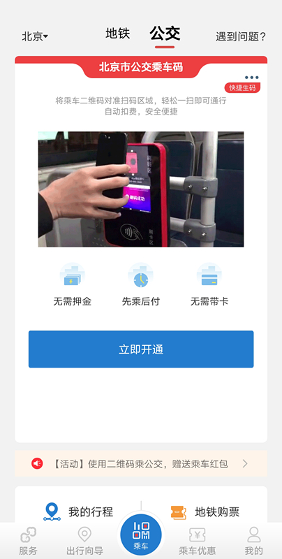 5月16日,北京公共交通正式推出“一碼通乘”服務(wù)。乘客可以使用北京公交APP、億通行APP或北京一卡通APP中的任意一款,刷碼乘坐北京地面公交車和地鐵,使用范圍覆蓋了北京城區(qū)和郊區(qū)全部1500余條常規(guī)地面公交線路(不含商務(wù)班車、合乘定制等多樣化線路),全部23條城市軌道交通線路,以及S2線、懷密線2條市郊鐵路線路;刷碼乘車和一卡通刷卡乘車一樣,享受北京公共交通票制票價(jià)優(yōu)惠政策。