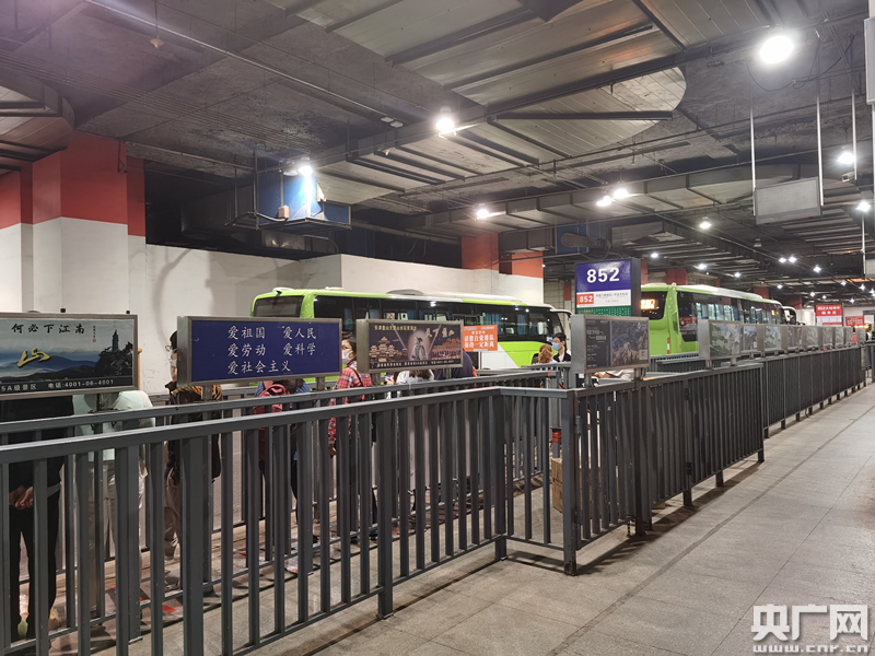北京市東直門交通樞紐內(nèi),乘客正在等候上車(央廣網(wǎng)記者 劉一荻 攝)