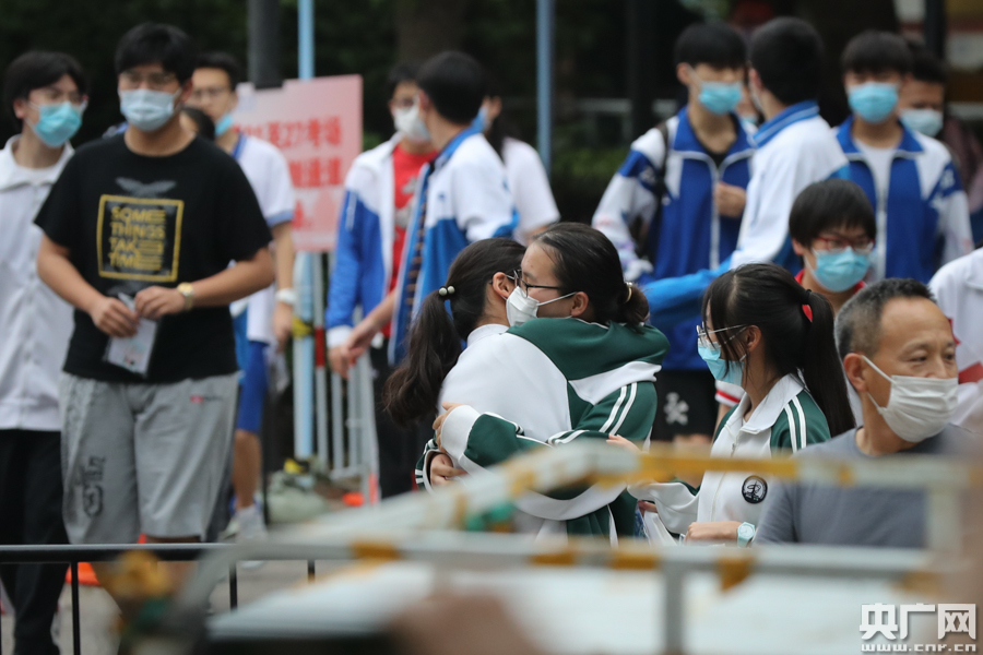 7月10日,北京中關(guān)村中學考點,兩名考生走出考場后擁抱(央廣網(wǎng)記者 韓靖 攝)