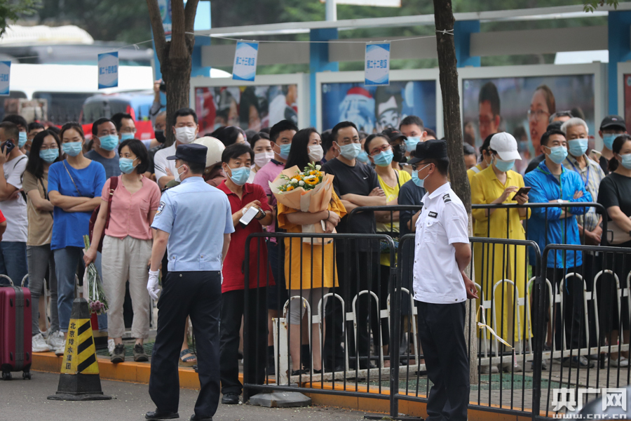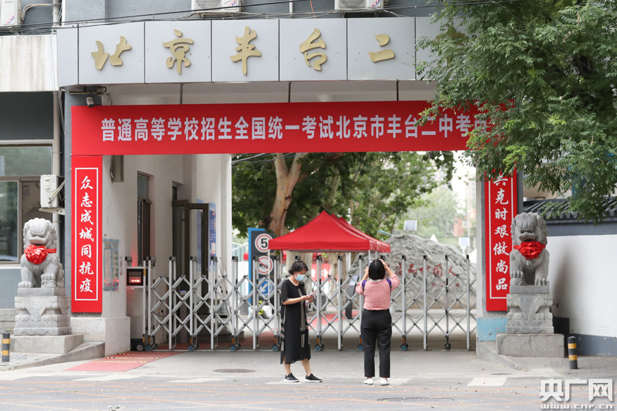 7月10日,中關(guān)村中學考點,考場外家長手拿鮮花等考生(央廣網(wǎng)記者 韓靖 攝)