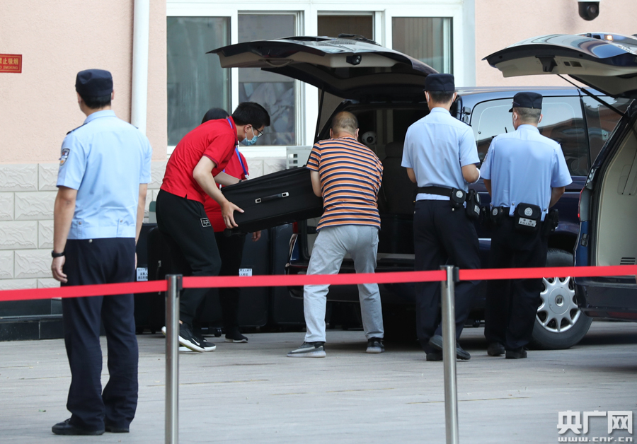 7月7日5時40分,北京市海淀區(qū)招生教育和考試中心,各考點校工作人員乘坐專用車輛前來領(lǐng)取考卷(央廣網(wǎng)記者 韓靖 攝)