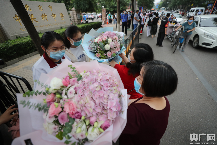 7月10日,北京中關(guān)村中學考點,高考結(jié)束后兩位家長向考生獻花(央廣網(wǎng)記者 韓靖 攝)