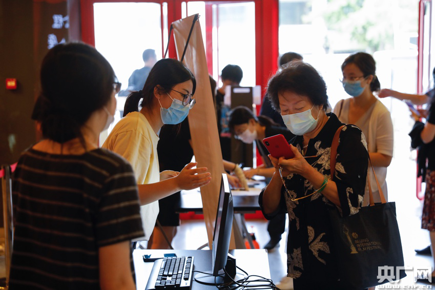 工作人員幫助觀眾進(jìn)行“北京健康寶”登記操作(央廣網(wǎng)記者張凱航 攝)