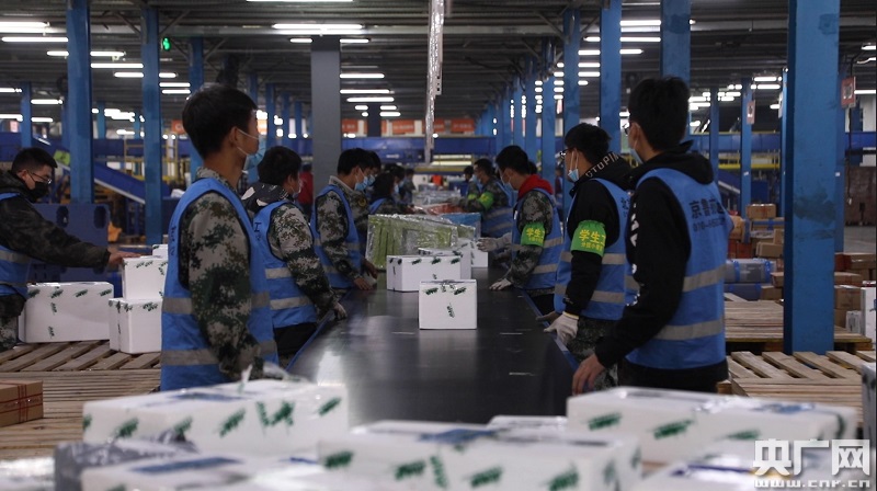 11月11日,蘇寧通州物流基地一片繁忙景象(央廣網(wǎng)記者 王晶 攝)