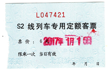 S2線專用定額車(chē)票(黃土店站售,2017年1月15日)