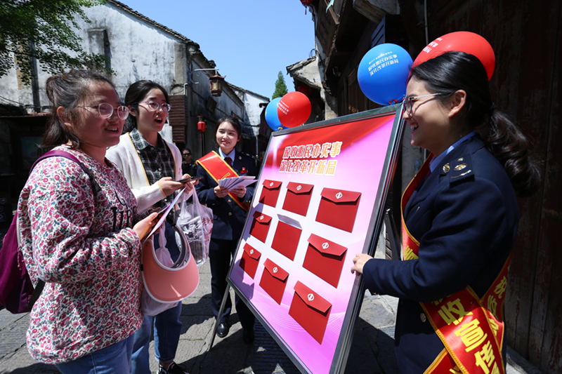 央廣網南京4月16日消息(記者鄭楚豫 通訊員駱靜思)2021年4月是第30個全國稅收宣傳月。近日,南京稅務第一稽查局“實干”稅收宣傳團來到高淳老街,組織以“稅收惠民辦實事、深化改革開新局”為主題的稅收宣傳月活動,為納稅人繳費人送去最新的稅收優(yōu)惠政策;顒赢斕,一群年輕的稅務干部在高淳老街的入口處忙著進行稅收九宮格問答、新政咨詢、相框合影,場面熱鬧非凡。