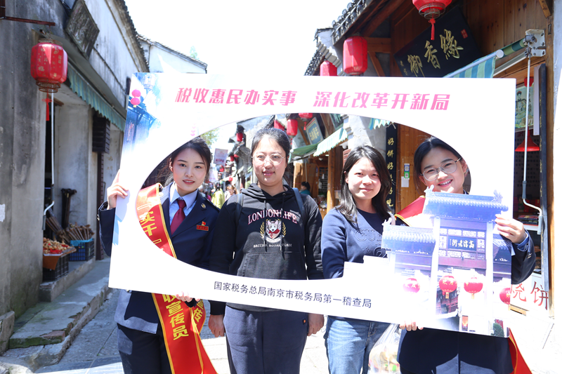 在“稅收惠民辦實事、深化改革開新局”的相框前,游客手持融入高淳老街地域元素的相框合影留念,一張張照片記錄下他們幸福的笑臉!拔沂侨ツ瓴趴既攵悇詹块T的年輕干部,今天是我第一次來到高淳參加稅收宣傳活動。”青年稅務干部吳奉頤表示,成為一名實干稅收宣傳員,切實為大家解答熱點問題,幫助到納稅人繳費人,是一件很有意義和成就感的事。