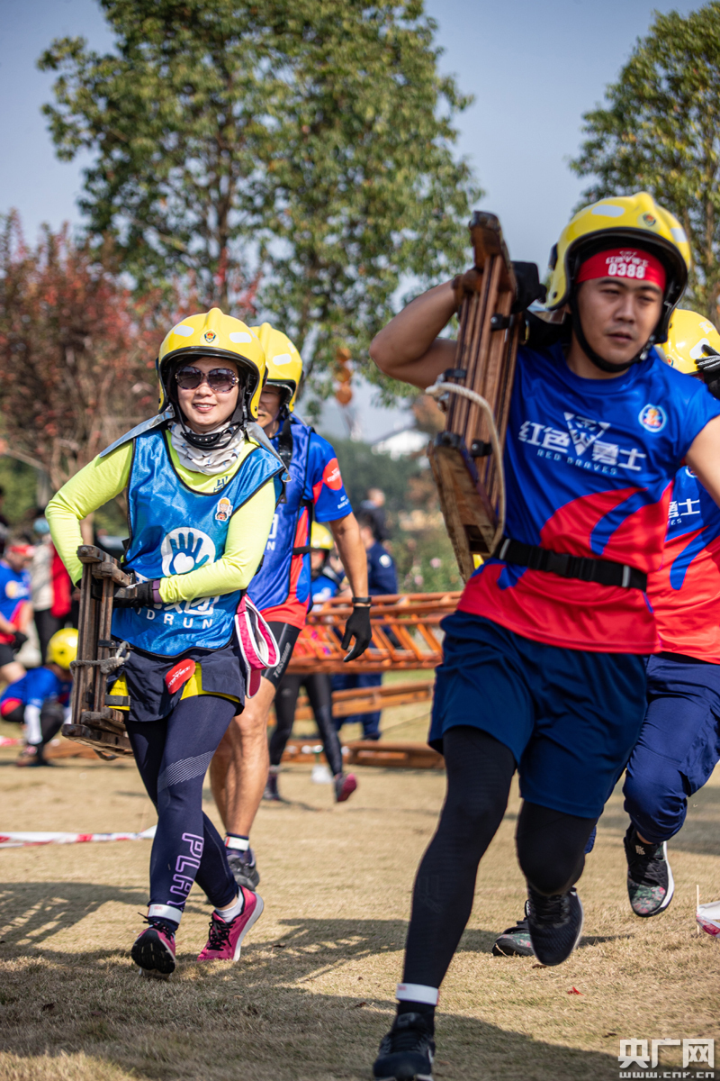 本屆“漢消杯”紅色勇士越野障礙賽,以“關(guān)注消防 生命至上”為主題,著力于將消防安全知識(shí)普及與全民健身運(yùn)動(dòng)有機(jī)結(jié)合?傎惓碳s5km,上千余人參與,共設(shè)有“險(xiǎn)阻穿行、緊急出動(dòng)、勇不可擋、鐵血上甘嶺、勝利基石、穿越火線、殘?jiān)笊、烈火英雄、生命至上、守護(hù)江城、雄心壯志、勝利之巔、勇往直前、砥礪前行、生命之索”等15個(gè)關(guān)卡。其中,“緊急出動(dòng)、險(xiǎn)阻穿行、生命至上”環(huán)節(jié)則情景再現(xiàn)了消防員平日的艱苦訓(xùn)練場(chǎng)景。參賽者需要自行組合,兩兩一組,佩戴消防救援頭盔,共同扛兩節(jié)6米拉梯負(fù)重前行,步調(diào)一致、團(tuán)結(jié)協(xié)作者,方能順利通關(guān)。