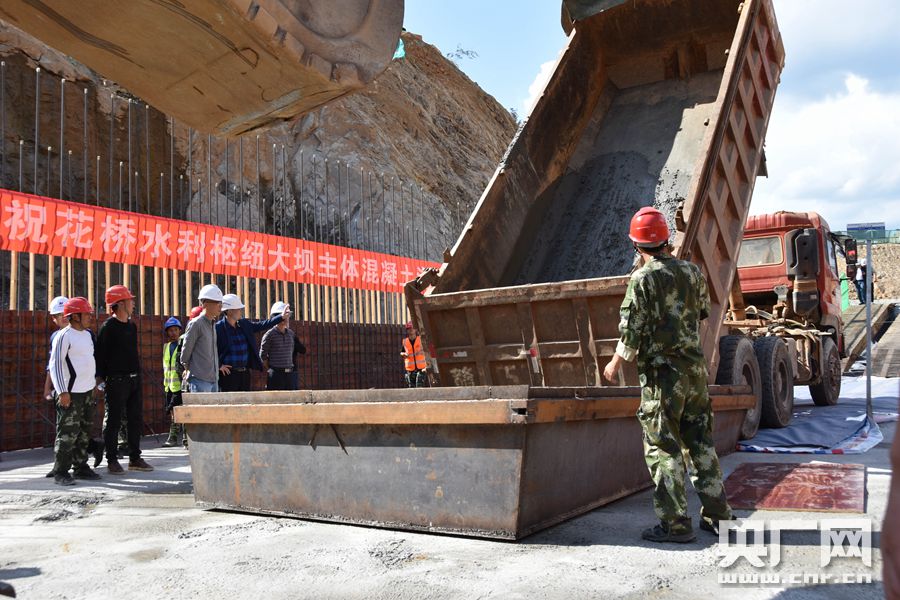 花橋水利樞紐工程大壩主體混凝土開倉澆筑(央廣網(wǎng)發(fā) 通訊員供圖)