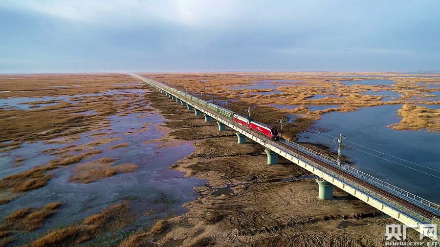 綜合檢測列車駛過臺(tái)特瑪湖大橋(央廣網(wǎng)發(fā) 陳劍飛攝)