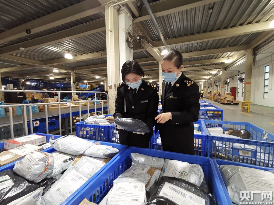楊劍(右)在監(jiān)管現(xiàn)場(chǎng)調(diào)研包裹通關(guān)情況(央廣網(wǎng)發(fā))