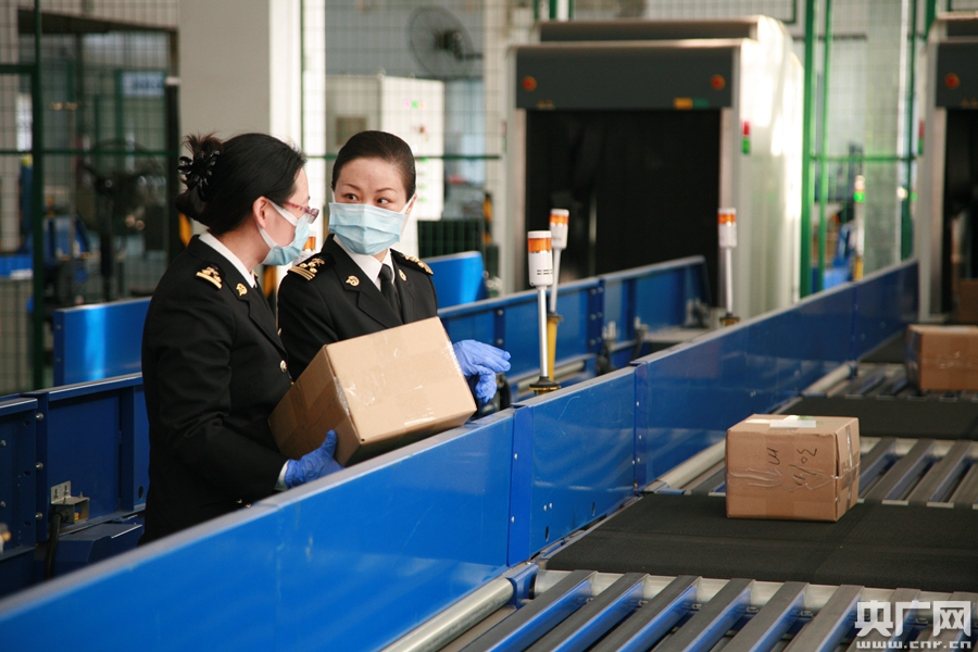 2020年2月20日楊劍(右)在郵遞物品監(jiān)管現(xiàn)場(chǎng)指導(dǎo)防疫物資通關(guān)(央廣網(wǎng)發(fā) 李勇 攝)