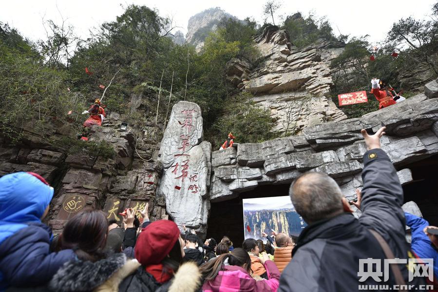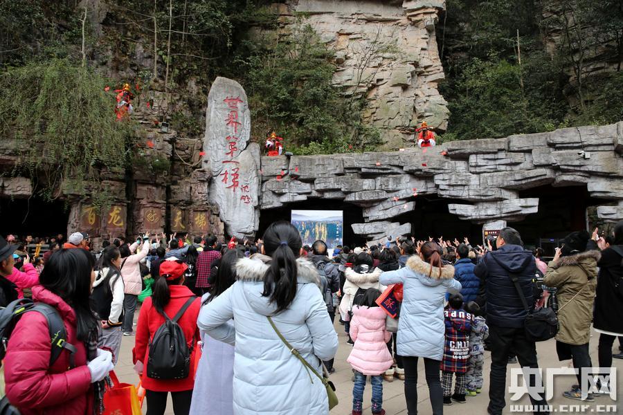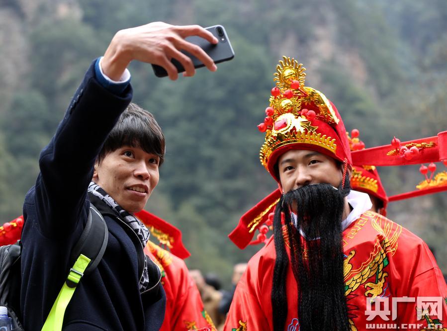 2月6日,在旅游勝地湖南張家界核心景區(qū)武陵源,張家界百龍?zhí)焯莨ぷ魅藛T裝扮成“財神”向中外游客送紅包,寓意雞年洪福齊天,旅游豐收,生活美滿