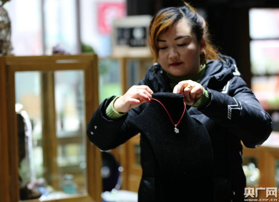 2018年1月15日,在湖南省張家界市武陵源區(qū)向王定制非物質(zhì)文化遺產(chǎn)生產(chǎn)保護(hù)展示基地,游人在挑選“生肖狗”銀飾 央廣網(wǎng)張家界1月16日消息(記者傅蕾 通訊員吳勇兵)農(nóng)歷“狗年”將至,湖南省張家界市武陵源區(qū)向王定制非物質(zhì)文化遺產(chǎn)生產(chǎn)保護(hù)展示基地定制出車(chē)掛、項(xiàng)鏈、手鐲、戒指等一系列造型精美、工藝獨(dú)特的“生肖狗”銀飾工藝品,滿足春節(jié)旅游市場(chǎng)需求。 -