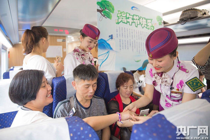 6月13日,在成都東開往上海虹橋的D354次動車組列車上,“動妹”正在為旅客系上象征吉祥的五彩繩(央廣網(wǎng)發(fā) 龔萱 攝)