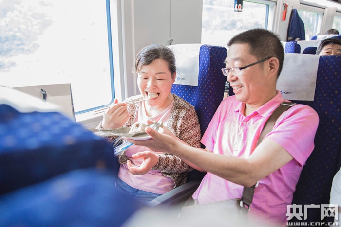 6月13日,在成都東開往上海虹橋的D354次動車組列車上,兩名旅客正在品嘗粽子(央廣網(wǎng)發(fā) 龔萱 攝)