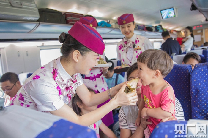 6月13日,在成都東開往上海虹橋的D354次動車組列車上,“動妹”正在喂小朋友吃粽子(央廣網(wǎng)發(fā) 龔萱 攝)