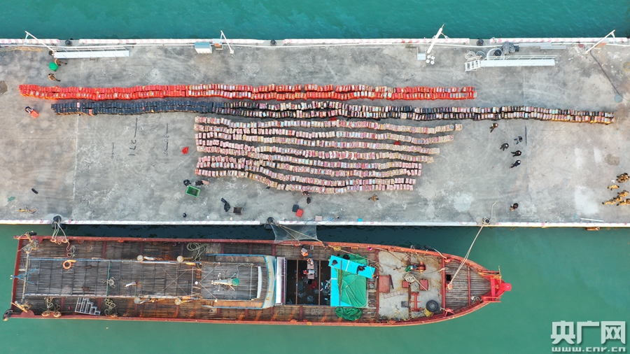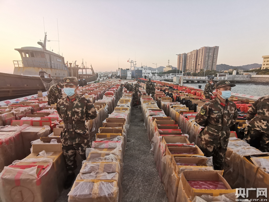 海警執(zhí)法員正在對現(xiàn)場走私煙草進(jìn)行清點(央廣網(wǎng)發(fā) 通訊員供圖)