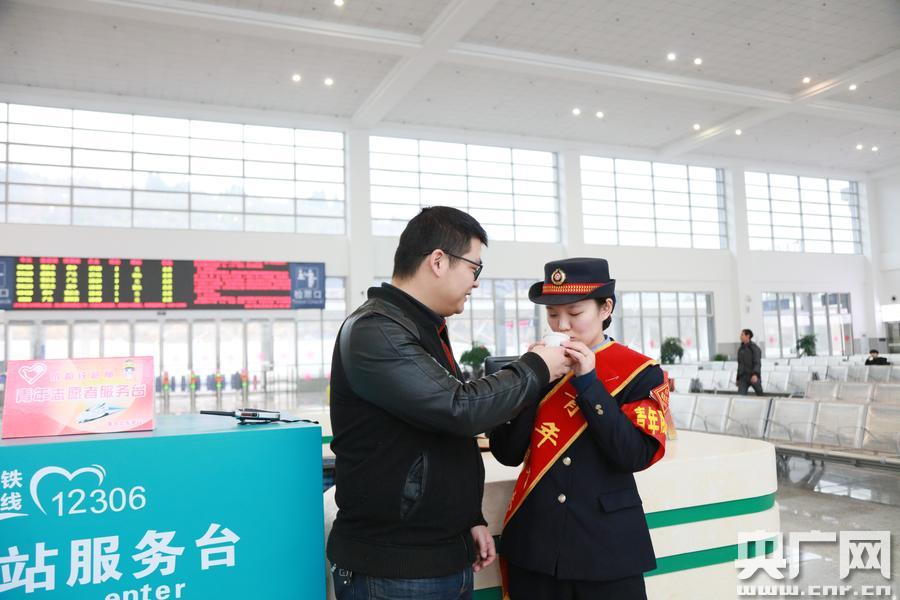 春運(yùn)路上的情人節(jié)(李勇 程禮松 攝)   央廣網(wǎng)重慶2月14日消息(記者劉湛 通訊員李勇 程禮松)正月十七,恰逢情人節(jié),處處都彌漫著甜蜜的氛圍,春運(yùn)最后一輪客流高峰的持續(xù)卻阻隔了不少鐵路職工在今天相遇。但他們依然通過手機(jī)、快遞傳情或準(zhǔn)備特別禮物,演繹了各種驚喜,將浪漫進(jìn)行到底,化作奮戰(zhàn)春運(yùn)的無盡動(dòng)力。管轄襄渝、蘭渝、高南、滬蓉線上12個(gè)客運(yùn)辦理站的重慶北車務(wù)段一線客運(yùn)職工大多是近3年分配而來的青工,他們或在熱戀中,或是新婚燕爾……   愛灑老區(qū)春運(yùn)路   “你看你都瘦了一圈了,一定要按時(shí)吃飯,有空了就多休息休息!2月14日,成都鐵路局重慶北車務(wù)段南部站售票廳里,客運(yùn)主任李青的愛人郭航志為她送來了情人節(jié)禮物,一盒新鮮的草莓和一支玫瑰花。   和李青一樣,郭航志也是一名鐵路客運(yùn)工作者,他在與李青相鄰的南充北站擔(dān)任客運(yùn)值班員。2012年,郭航志與剛畢業(yè)入路不久的李青相識(shí)在“三江明珠”合川站。2014年,二人曾相約廣安南站獻(xiàn)身“小平故里”高南線開通初期的建設(shè),并在那里許下誓言結(jié)為連理。2015年,小夫妻又共同踏上了精準(zhǔn)扶貧線蘭渝鐵路的墾荒征程。   四年多的歷練,李青已經(jīng)從青澀的小女生成長(zhǎng)為了南部站客運(yùn)主任,郭航志也不甘落后擔(dān)當(dāng)起了南充北站客運(yùn)值班員;楹,二人輾轉(zhuǎn)高南線、蘭渝線,一心撲在新線建設(shè)和客運(yùn)工作上。結(jié)婚三年來,二人的婚禮一推再推,裝好的新房二人都沒有一道去看過。   “明天,我準(zhǔn)備回趟老家,把我媽接來,一來她可以先把新房子收拾收拾,二來我媽身體不好,離近點(diǎn)也好有個(gè)照應(yīng)。今年,無論如何都要把我們的婚禮辦了。一直這么虧欠你,我的心里很不好受!”郭航志看著略顯單薄的李青說。   緣起鐵路情更濃   “起初我們都不認(rèn)識(shí)對(duì)方,是2014年在一次團(tuán)委組織的聯(lián)誼活動(dòng)上認(rèn)識(shí)的,我們都來自黑龍江鶴崗,他人很好,誠(chéng)實(shí)、可靠、有擔(dān)當(dāng)、責(zé)任心強(qiáng)……”手里拿著自己最愛吃的巧克力,馮麗文談起自己和丈夫的相識(shí)、相知、相戀過程,一臉幸福。馮麗文口中的“他”正是自己的丈夫趙陽,兩人均為成都鐵路局重慶北車務(wù)段潼南車站職工,馮麗文是客運(yùn)員,趙陽擔(dān)任助理值班員。   緣起鐵路。原來,馮麗文和趙陽的家鄉(xiāng)都在千里之外的黑龍江省鶴崗市,且只有一街之隔,但兩人起初并不認(rèn)識(shí),通過一次聯(lián)誼活動(dòng)認(rèn)識(shí)之后兩人的感情“一發(fā)不可收拾”。從鶴崗到潼南,從鄰居變同事,工作上互相幫助,生活中彼此關(guān)心,一個(gè)溫暖的眼神,一句貼心的問候,這一切讓身在異鄉(xiāng)的兩個(gè)人漸漸篤定對(duì)方就是彼此心中的那個(gè)人。   奮戰(zhàn)春運(yùn)。2015年9月,馮麗文和趙陽為他們的愛情烙下了鮮紅的印章、領(lǐng)證結(jié)婚。今年是二人婚后的第二個(gè)春運(yùn),但他們還是與去年一樣,放棄了回家,選擇和車站同事們一起堅(jiān)守春運(yùn)。由于所在的崗位不同且都是倒班制,雖然同在一個(gè)車站,但二人卻是聚少離多,站臺(tái)、食堂、樓道便是他們“偶遇”的最佳地方。“今年春運(yùn)我是‘幸運(yùn)’的,因?yàn)榇竽耆臅r(shí)候我們兩是一起過的,我們一起吃了自己做的年夜飯,還一起給家里的爸媽視頻拜年了呢!”問起年三十怎么過的,馮麗文對(duì)記者說到。   2月14日,春運(yùn)第33天,趙陽當(dāng)上夜班,馮麗文輪休,整天忙于客運(yùn)工作的馮麗文早就忘了這是個(gè)情人節(jié),但是細(xì)心的趙陽卻一直記得,這是兩人在一起“過”的第一個(gè)情人節(jié)。就在趙陽準(zhǔn)備出門上班,馮麗文為丈夫整理領(lǐng)帶,準(zhǔn)備出門上班的時(shí)候,趙陽一手妻子緊緊抱在懷中,一手從身后拿出早已準(zhǔn)備好的妻子最愛吃的巧克力,這個(gè)情人節(jié)他們真正過了。 “雖然她總說不怪我,但我也想給她一個(gè)‘情人節(jié)’。雖然我們現(xiàn)在還沒有自己的房子,但有她在的地方就是家。”上班路上,趙陽邊下樓梯邊告訴記者。