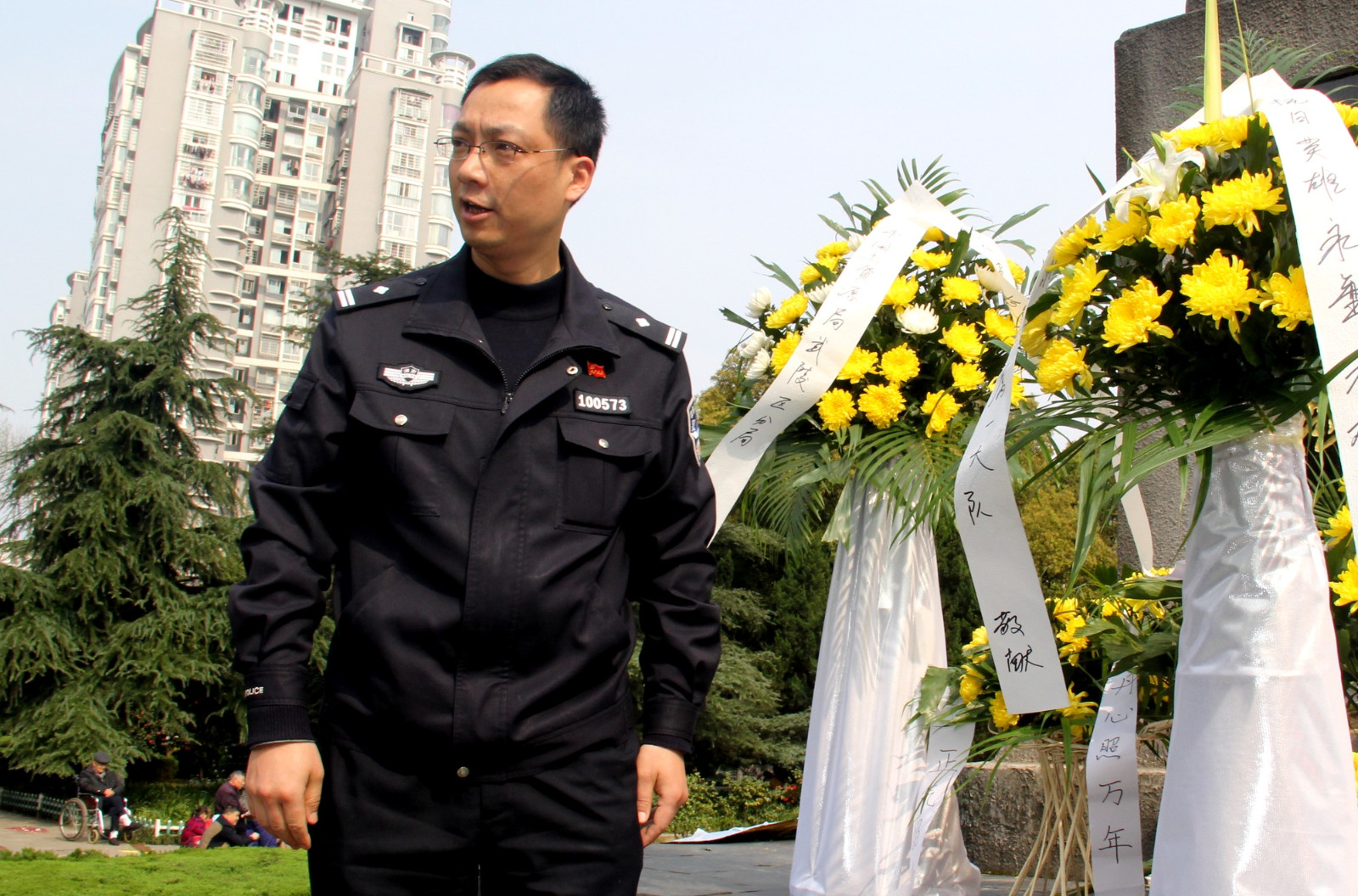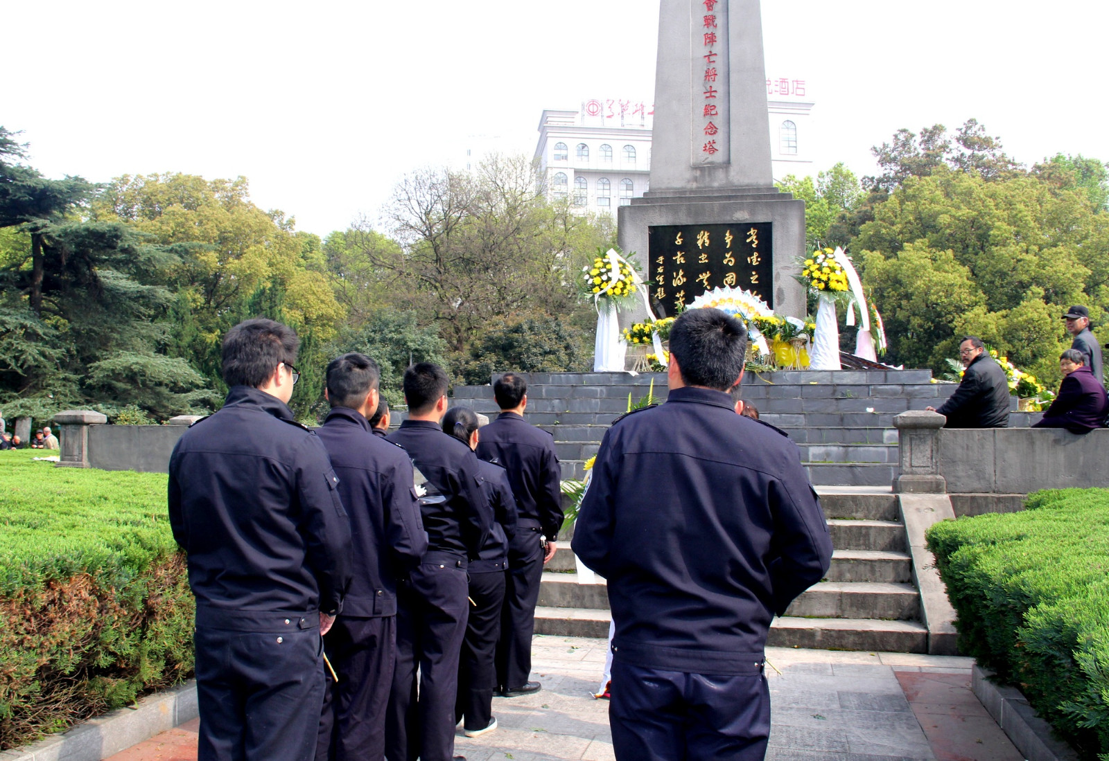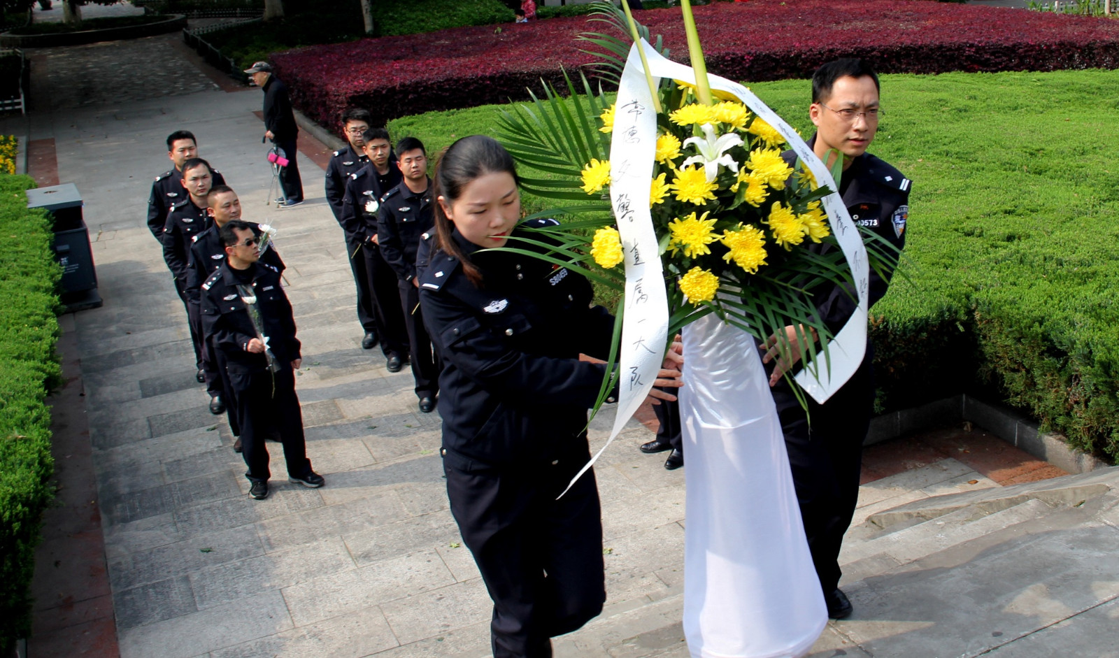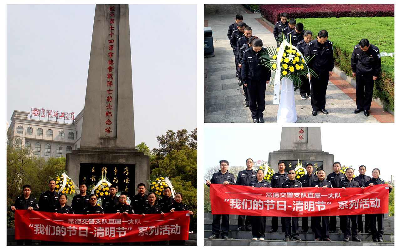 向烈士獻(xiàn)花籃 參加活動(dòng)的民警、協(xié)警們懷著無(wú)比崇高的敬意向?yàn)樽鎳?guó)、為人民、為常德這座城市在抗戰(zhàn)期間貢獻(xiàn)生命的英烈們鞠躬,獻(xiàn)花藍(lán),并默哀一分鐘。在紀(jì)念碑下,副大隊(duì)長(zhǎng)楊軍輝向大家講述了抗戰(zhàn)中常德會(huì)戰(zhàn)的重要意義和以身殉職革命先烈們的英雄事跡,號(hào)召大家一定要繼承先烈遺志,學(xué)習(xí)他們不畏艱險(xiǎn)、勇往直前的敢戰(zhàn)精神;學(xué)習(xí)他們熱愛(ài)和平,忠于人民、忠于國(guó)家的犧牲精神,并把這種精神以飽滿的政治熱情投入到自己當(dāng)前從事的公安交管工作中去,同時(shí)也要珍惜革命先烈用鮮血和生命換來(lái)安定與祥和的社會(huì)、立足本職,扎實(shí)工作,為保一方暢安貢獻(xiàn)自己的力量。 -
