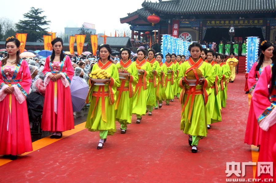 山西舉行第二十七屆大槐樹文化節(jié)尋根祭祖大典 央廣網(wǎng)洪洞4月5日消息(記者賀威通)清明時節(jié)尊祭先祖,家國文化綿延千年。丁酉年4月4日上午,“第二十七屆洪洞大槐樹文化節(jié)尋根祭祖大典”在洪洞大槐樹景區(qū)萬人祭祖廣場舉行。來自全國十八個省市的大槐樹移民后裔代表及社會各界人士,共計萬余人齊聚一堂,共同祭奠大槐樹移民先祖。 上午9時許,第二十七屆洪洞大槐樹文化節(jié)尋根祭祖大典在陣陣禮炮聲中拉開了帷幕。本次大典以“清明大槐樹 百姓共尋根”為主題,分為“百姓歸源、中華共祭、家國同夢”三個篇章。大典嚴(yán)格遵循國家級非物質(zhì)文化遺產(chǎn)——“大槐樹祭祖習(xí)俗”,依次進(jìn)行“恭迎汾河水、舜王土”、“恭請大槐樹移民先祖升位”、“鳴炮、啟門”、“敬獻(xiàn)三牲”、“敬獻(xiàn)五谷”、“敬獻(xiàn)肴饌”、“敬獻(xiàn)鮮果”、“敬獻(xiàn)厚土”、“敬香達(dá)神”、“奠酒獻(xiàn)禮”、“敬獻(xiàn)花籃”、“恭誦祭文”、“鞠躬辭神”、“敬獻(xiàn)樂舞祭”等傳統(tǒng)議程,環(huán)節(jié)絲絲入扣,處處透著大槐樹根祖文化的深厚底蘊(yùn)和移民后裔對大槐樹老家的無限深情。在這其中的“敬獻(xiàn)樂舞祭”更是通過歌祭、鼓祭、舞劇三種方式將廣大古槐移民后裔崇宗尊祖、心連家國的心情表達(dá)的淋漓盡致。 六百年前,一場聲勢浩大的移民使“大槐樹”成為了億萬移民后裔魂牽夢繞的精神家園。今天,“大槐樹”將“大槐樹祭祖習(xí)俗”延續(xù),傳承著家國之夢,承載著移民之情。 一直以來,為了順應(yīng)億萬移民后裔的共同心愿,洪洞縣從1991年開始連續(xù)舉辦了二十七屆大槐樹文化節(jié)尋根祭祖大典。 -