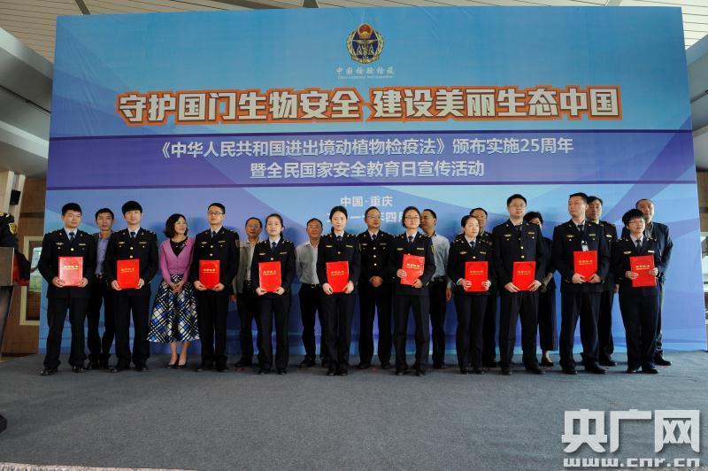 主題活動現(xiàn)場(央廣網(wǎng)記者 陳鵬 攝) 央廣網(wǎng)重慶4月15日消息(記者陳鵬)為了紀(jì)念《中華人民共和國進(jìn)出境動植物檢疫法》頒布實施25周年和第二個全民國家安全教育日,4月14日,重慶檢驗檢疫局在重慶江北國際機場T2航站樓開展了“守護國門生物安全·建設(shè)美麗生態(tài)中國”主題宣傳活動。活動中,還首次給檢驗犬“辛巴”進(jìn)行了表彰。 活動當(dāng)天,重慶機場檢驗檢疫局與中國航空股份有限公司等4家航空公司簽訂了“國門生物安全進(jìn)機艙”協(xié)議;顒又,與會部門共同呼吁全社會關(guān)注國門生物安全,并提出倡議:一是認(rèn)真了解、自覺遵守《中華人民共和國進(jìn)出境動植物檢疫法》及《中華人民共和國禁止攜帶、郵寄進(jìn)境的動植物及其產(chǎn)品名錄》規(guī)定。二是在進(jìn)出境過程中,自覺配合口岸檢驗檢疫機構(gòu)查驗工作。已攜帶動植物及其產(chǎn)品進(jìn)境的,請向現(xiàn)場檢驗檢疫官員申報或主動投棄。三是主動向身邊人、同行者介紹中國政府關(guān)于動植物檢疫方面的法律要求,提醒并倡議大家共同遵守。 隨著國際貿(mào)易迅速發(fā)展,人員往來日益頻繁,2016年我國進(jìn)出境旅客達(dá)5.7億人次,各類交通工具進(jìn)出境2899萬次,進(jìn)出境快件6.25億件;2016年全國動植檢戰(zhàn)線截獲外來有害生物6035種,122萬次,其中檢疫性有害生物360種,11.8萬次。旅郵檢截獲禁止進(jìn)境物58.3萬批次,檢出有害生物8.05萬次。 2016年,重慶口岸進(jìn)出境旅客達(dá)265萬人次,進(jìn)境郵包256.53萬個。為了嚴(yán)守國門生物安全,防止外來生物通過旅客攜帶、郵寄進(jìn)境,重慶檢驗檢疫局一方面加強口岸標(biāo)準(zhǔn)化建設(shè),在郵局、機場快件、機場旅檢口岸分別配置了CT機、X光機,補充了檢疫犬隊伍,提升口岸查驗?zāi)芰Γ涣硪环矫嫱ㄟ^風(fēng)險分析,加大高風(fēng)險國家和地區(qū)貨物、旅客郵寄物、攜帶物查驗力度,提升檢出率。2016年在重慶各口岸共計截獲動植物疫情556種、2270次,其中檢疫性有害生物29種,75次。同時,重慶檢驗檢疫局按照國家質(zhì)檢總局部署,開展了針對打擊非法郵寄、攜帶植物種子、種苗的“綠蕾”專項行動,2016年截獲各類植物繁殖材料157批次,檢出有害生物199種次。 2017年重慶檢驗檢疫局將繼續(xù)狠抓口岸查驗機制和口岸規(guī)范化建設(shè),嚴(yán)把國門生物安全關(guān);更加深入地開展綠蕾3專項行動,形成打擊非法攜帶、郵寄植物種子種苗入境的高壓態(tài)勢。