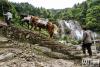 騾馬馱著石材艱難上山,用于翻修景區(qū)老路。 -