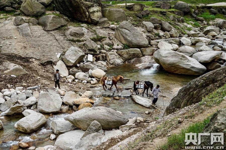 馱著石材的馬隊(duì)趟過小河進(jìn)山。
