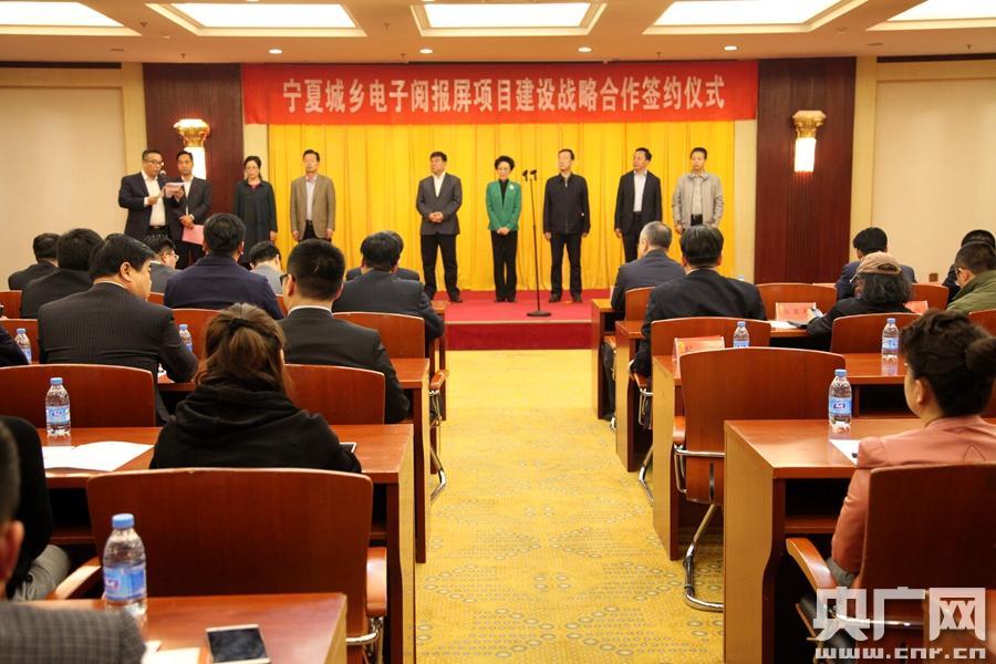 簽約儀式現(xiàn)場(chǎng)(央廣網(wǎng)記者許新霞 攝) 央廣網(wǎng)銀川4月25日消息(記者許新霞)寧夏城鄉(xiāng)電子閱報(bào)屏項(xiàng)目今天下午在銀川舉行戰(zhàn)略合作簽約儀式。項(xiàng)目總投資6億元,計(jì)劃建設(shè)10000個(gè)點(diǎn),分兩期建成。 寧夏城鄉(xiāng)電子閱報(bào)屏項(xiàng)目是由中國(guó)新聞文化促進(jìn)會(huì)組織發(fā)起、社會(huì)力量參與的全國(guó)性公共文化設(shè)施建設(shè)工程,旨在深入貫徹落實(shí)《中華人民共和國(guó)公共文化服務(wù)保障法》的實(shí)施及中辦、國(guó)辦《關(guān)于加快構(gòu)建現(xiàn)代公共文化服務(wù)體系的意見(jiàn)》文件精神,推動(dòng)全民閱讀和公共文化服務(wù)網(wǎng)絡(luò)建設(shè)的健康發(fā)展。 -