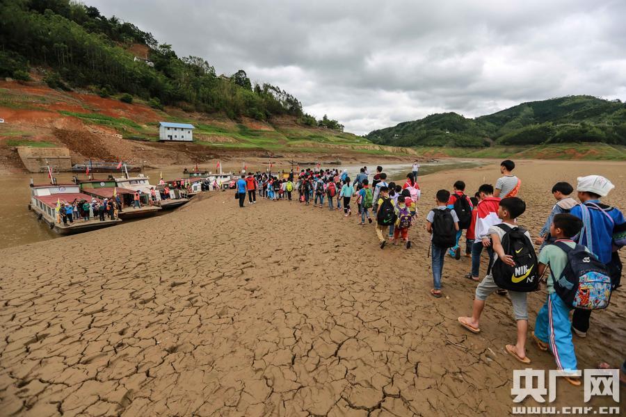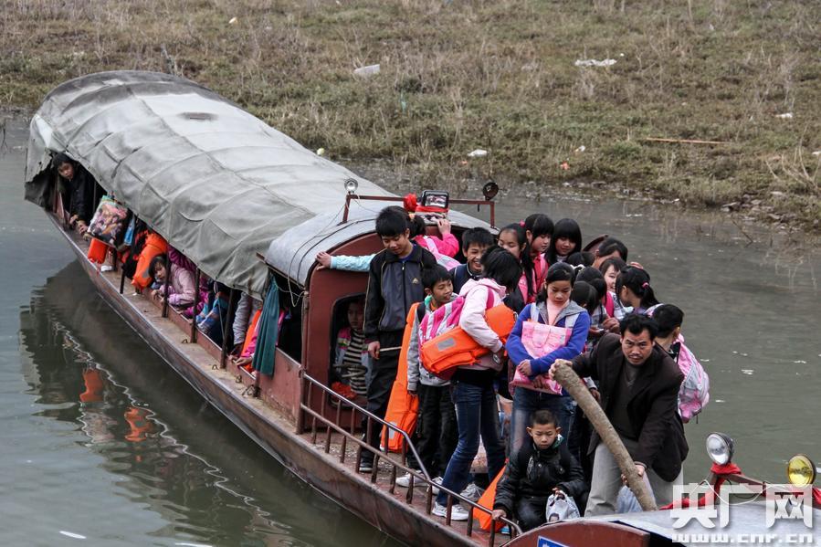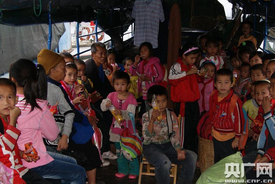 每周五,西林縣八大河希望學(xué)校的孩子們排隊乘坐免費“校船”回家 -