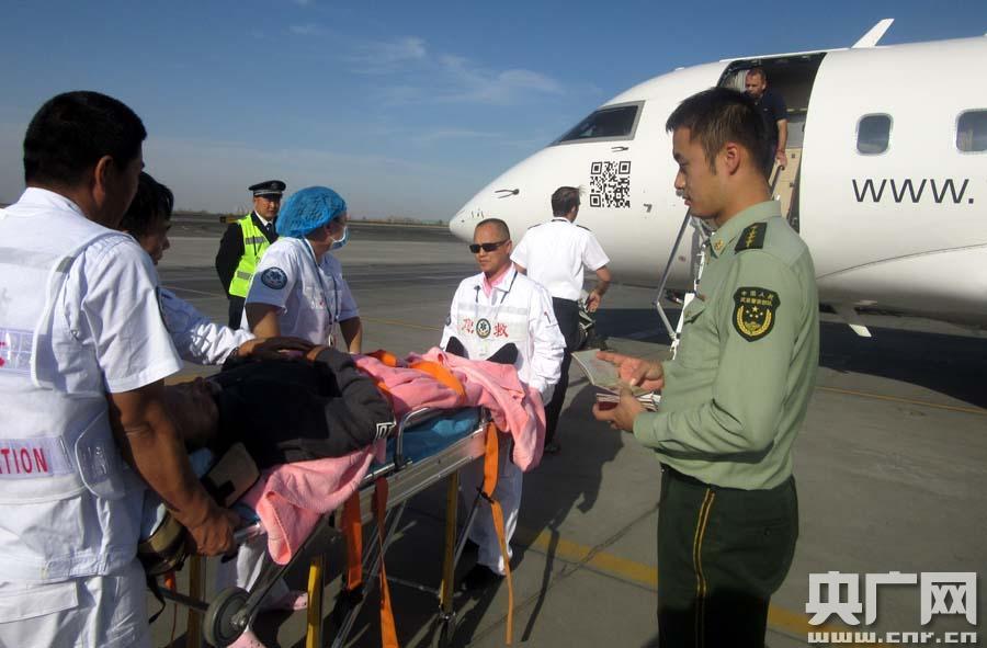 •      烏魯木齊邊檢站官兵正在為受傷德國(guó)旅客辦理出境手續(xù)(央廣網(wǎng)發(fā) 單國(guó)虎攝)   央廣網(wǎng)烏魯木齊9月29日消息(記者張雷 通訊員李康強(qiáng) 單國(guó)虎)9月28日中午,新疆公安邊防總隊(duì)烏魯木齊邊檢站接到一名德國(guó)籍旅客的求助電話稱,其在境內(nèi)登山遇險(xiǎn)摔成重傷,欲乘急救飛機(jī)出境,希望邊檢站提供通關(guān)便利。   接到求助電話后,烏魯木齊邊檢站執(zhí)勤業(yè)務(wù)一科室迅速啟動(dòng)應(yīng)急預(yù)案,開(kāi)通“綠色通道”,積極聯(lián)系相關(guān)聯(lián)檢單位及航空急救中心,將旅客直接送至停機(jī)坪登機(jī),同時(shí)派出經(jīng)驗(yàn)豐富檢查員前往機(jī)坪人證對(duì)照,集中查驗(yàn)護(hù)照。隨后,邊檢官兵僅僅用時(shí)10分鐘時(shí)間就完成了旅客出境及機(jī)組放飛手續(xù)。邊檢官兵體恤親和的服務(wù)及雷厲風(fēng)行的工作作風(fēng)給旅客留下深刻印象,受到在場(chǎng)部門的一致好評(píng)。
