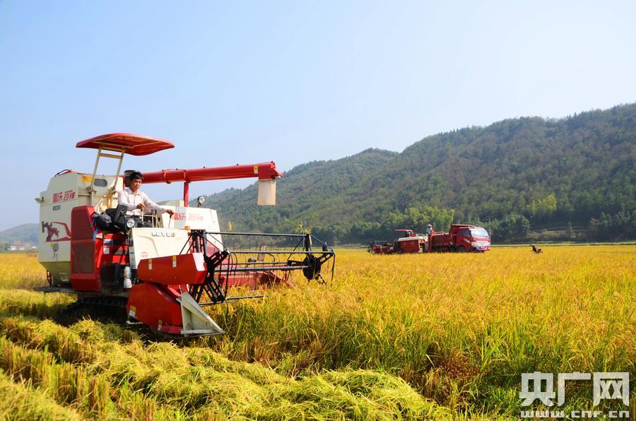在湖南省懷化市溆浦縣水東鎮(zhèn)千畝再生稻高產(chǎn)示范片,收割機正忙著收割再生稻。(央廣網(wǎng)發(fā) 曾偉攝) 據(jù)了解,今年湖南省農(nóng)技推廣總站在懷化溆浦創(chuàng)辦示范片,種植面積達1069畝,選擇“Y兩優(yōu)9918”“甬優(yōu)4149”等優(yōu)勢品種,全程機械化生產(chǎn),每畝可增收1000元。
