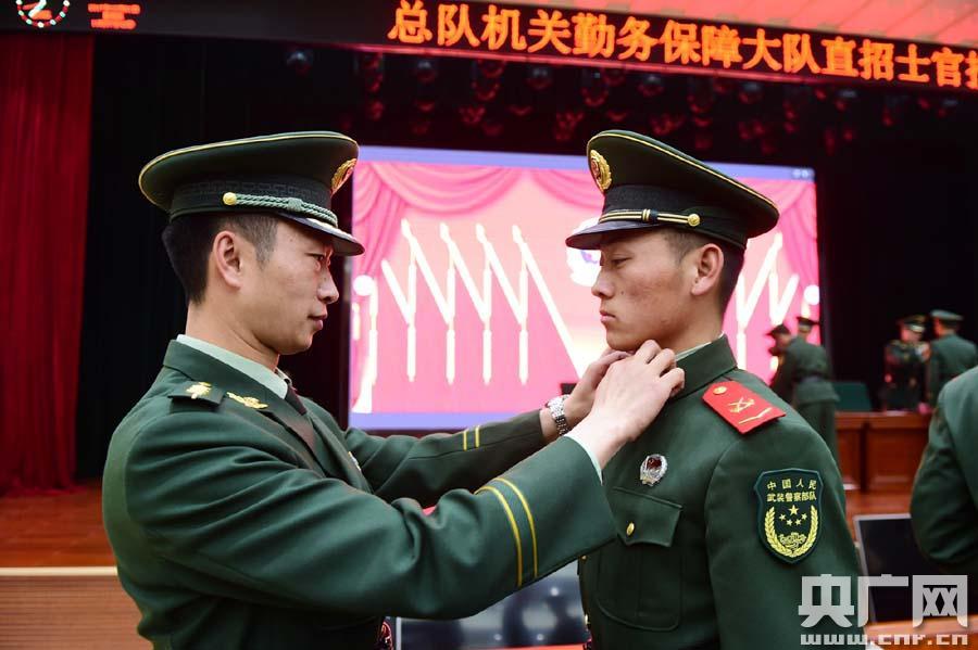 一名警官為直招士官佩戴警銜(央廣網(wǎng)發(fā) 馬士寶攝) -