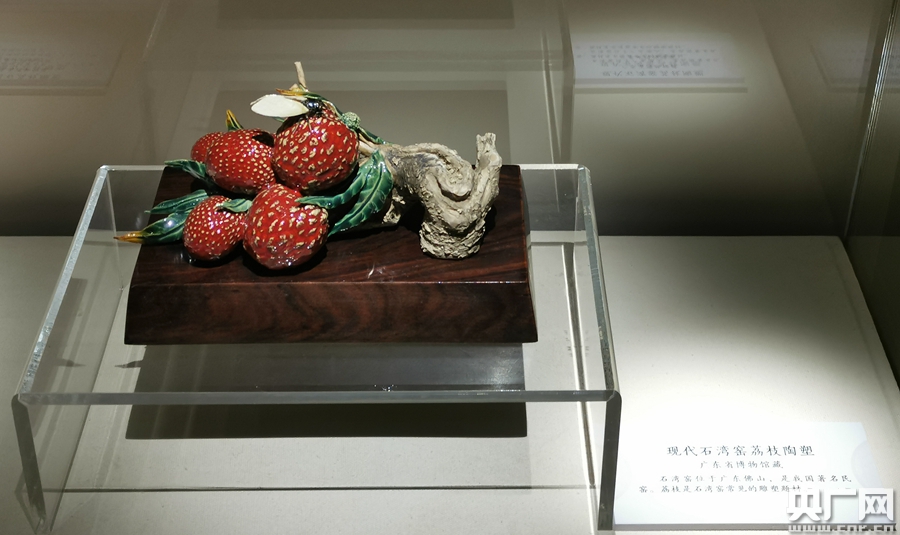 “不辭長(zhǎng)作嶺南人——荔枝文化展”在廣東省博物館開幕。圖為現(xiàn)代石灣荔枝陶塑(央廣記者 鄭澍 攝)