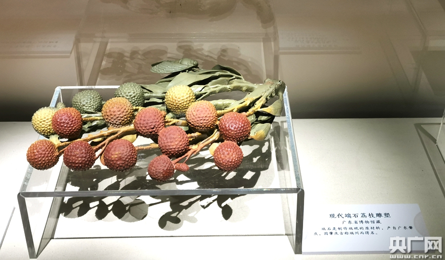 “不辭長(zhǎng)作嶺南人——荔枝文化展”在廣東省博物館開幕。圖為現(xiàn)代端石荔枝雕塑(央廣記者 鄭澍 攝)