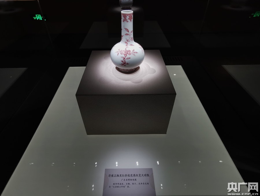 “不辭長(zhǎng)作嶺南人——荔枝文化展”在廣東省博物館開幕。圖為清雍正釉里紅折枝花果紋瓷天球瓶(央廣記者 鄭澍 攝)