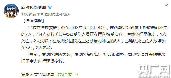 2019年4月11日晚,深圳市瞬時強降雨引發(fā)洪水,到目前為止,死亡人數(shù)增至6人,相關(guān)救援工作仍在緊張進(jìn)行。