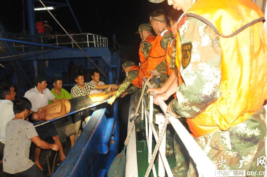 海警官兵將骨折受傷漁民從漁船轉(zhuǎn)移到警艇上(央廣網(wǎng)記者 陳庚 攝)