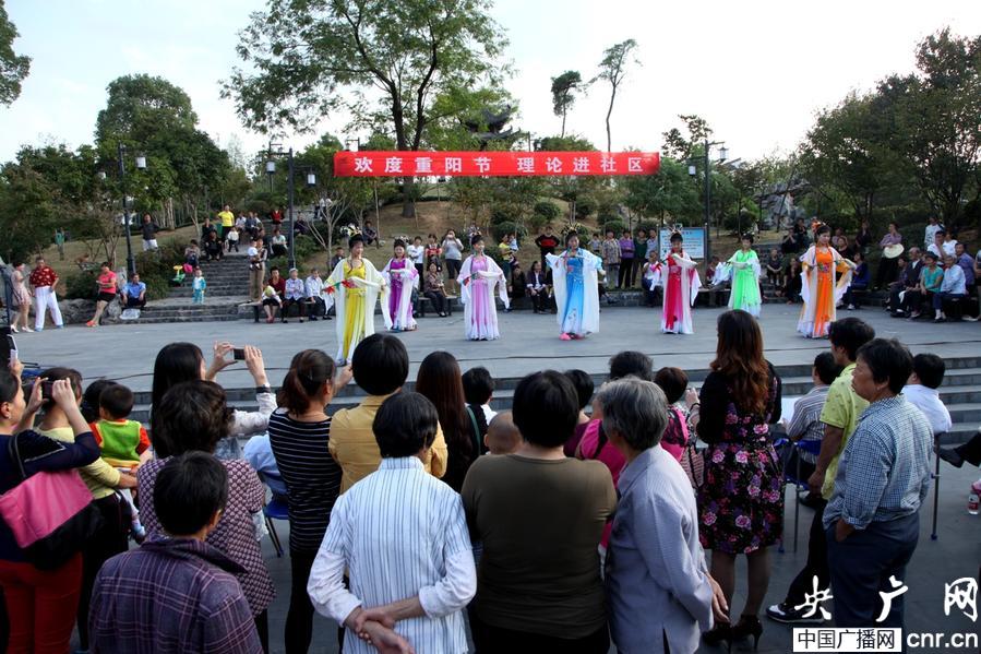 重陽(yáng)節(jié)前夕,安徽歙縣城鄉(xiāng)自編自演老年人喜愛(ài)的歌舞,并把“中國(guó)夢(mèng)”、“理性看齊心辦”等理論知識(shí)穿插在快板和有獎(jiǎng)問(wèn)答中,把快樂(lè)和理論知識(shí)同時(shí)帶進(jìn)社區(qū)、鄉(xiāng)村。