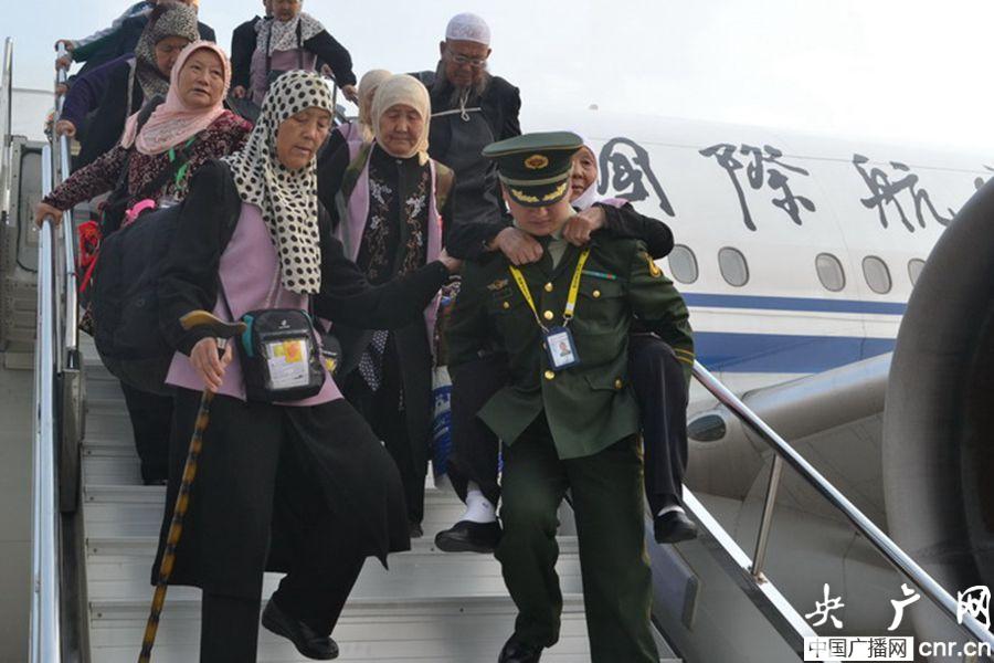 邊檢官兵正在幫助行動不便的穆斯林群眾下飛機(央廣網(wǎng)發(fā) 劉玉飛 鄧子晗 攝)