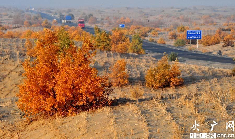 新疆第二條沙漠公路和田至阿拉爾公路旁的原始胡楊林(央廣網(wǎng)記者 張雷 攝)