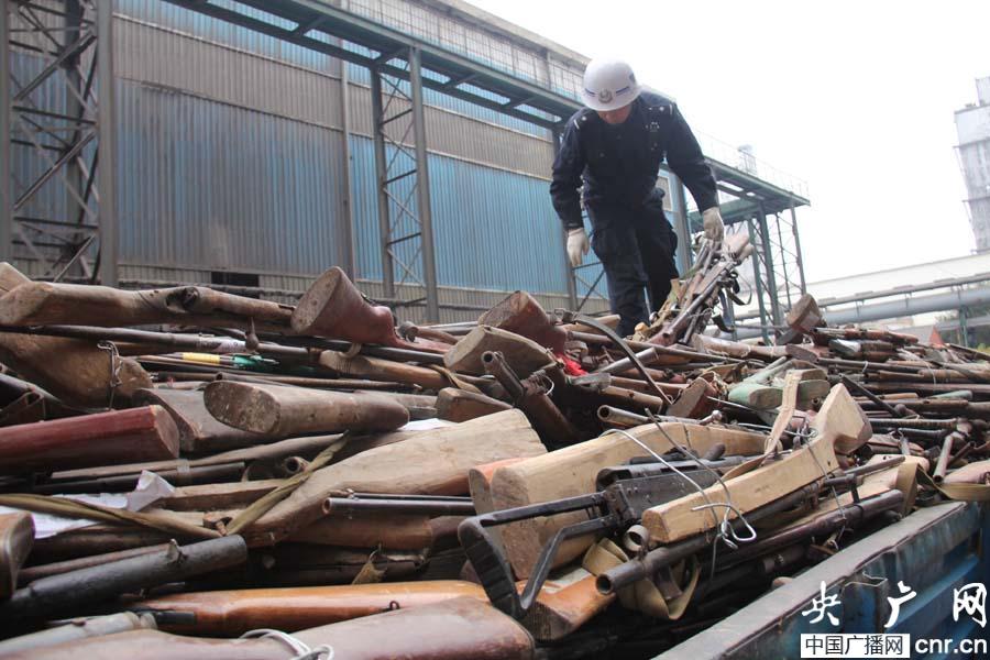 央廣網(wǎng)蘭州10月31日消息(記者焦健 王居蔚)伴隨著煉鋼爐中騰起的一團烈火,爐內(nèi)的非法槍支已經(jīng)瞬間化為鐵水。煉鋼廠門口的空地上五輛滿載著非法槍支的大卡車一字排開。車上的一萬余支非法槍支正等待著同樣的命運。今天上午,甘肅省公安廳在蘭州榆中鋼廠對“緝槍治爆”專項行動中收繳的12252支非法制造的火藥槍、獵槍、氣槍,7568支仿真槍、8967把管制刀具予以安全銷毀。