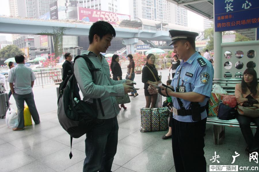 曾芝強在十八大安保中對可疑人員身份核對(照片由廈門鐵路公安處提供)