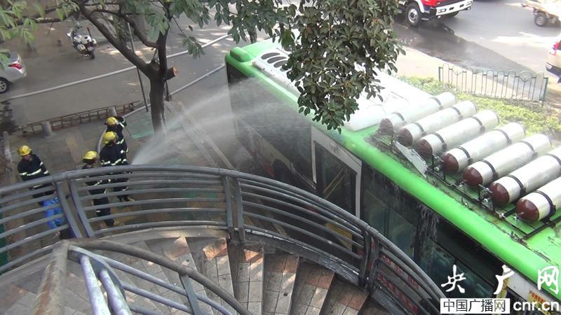 事故發(fā)生在嘉禾路馬垅天橋下,8時14分,中隊(duì)官兵到達(dá)現(xiàn)場后,看到公交車停在路邊,車頂上的天然氣發(fā)出“嘶嘶”泄漏聲,現(xiàn)場充斥著濃重的煤氣味。司機(jī)反映,996路公交車是天然氣動力車,車頂上有7個氣瓶裝有200公斤天然氣的氣瓶,其中一個氣瓶發(fā)生泄漏。