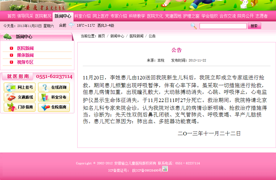 央廣網(wǎng)合肥11月23日消息(記者王利)11月20日,安徽省立兒童醫(yī)院送到合肥殯儀館的一名男嬰在火化前“復(fù)活”,這一事件引起社會(huì)廣泛關(guān)注。11月22日,安徽省立兒童醫(yī)院發(fā)布公告稱,雖然采取一切措施進(jìn)行搶救,但是患兒病情加重,出現(xiàn)瞳孔散大,大動(dòng)脈搏動(dòng)消失,心跳、呼吸停止,心電監(jiān)護(hù)儀顯示生命體征消失,于11月22日11時(shí)27分死亡。